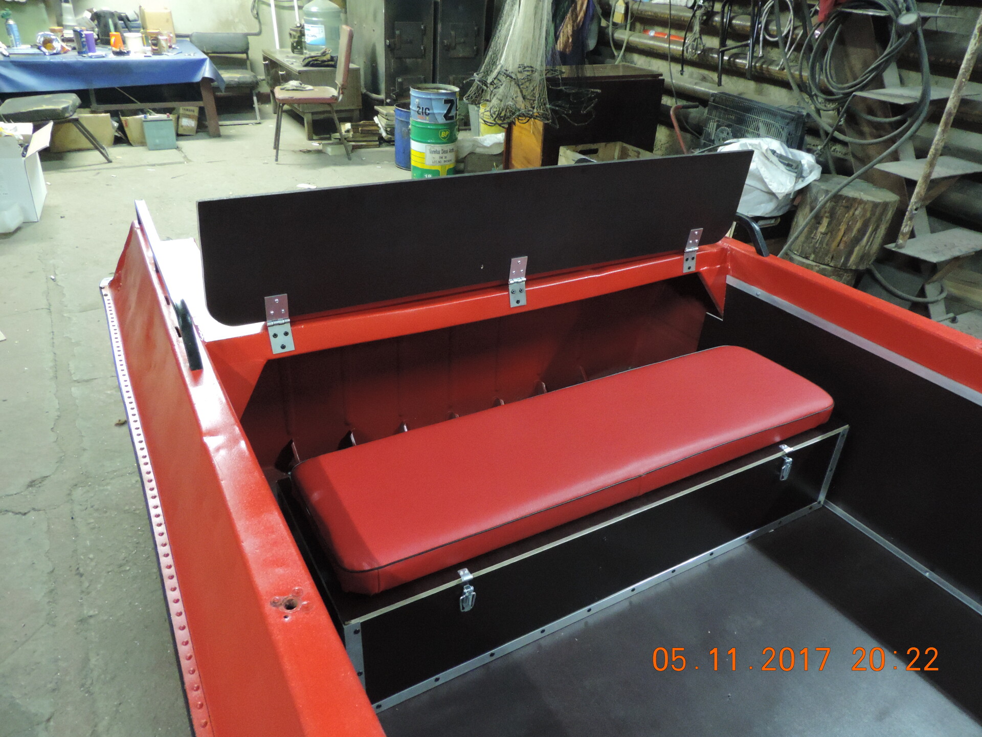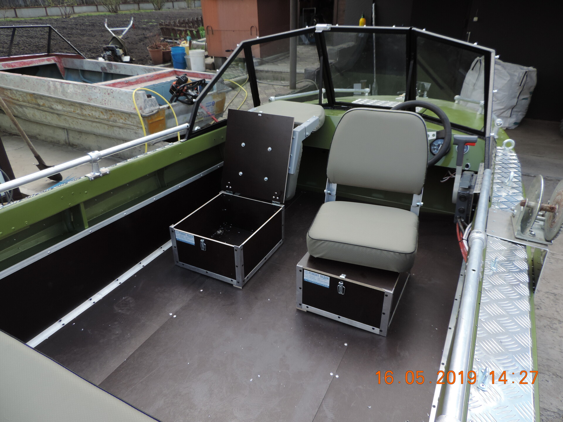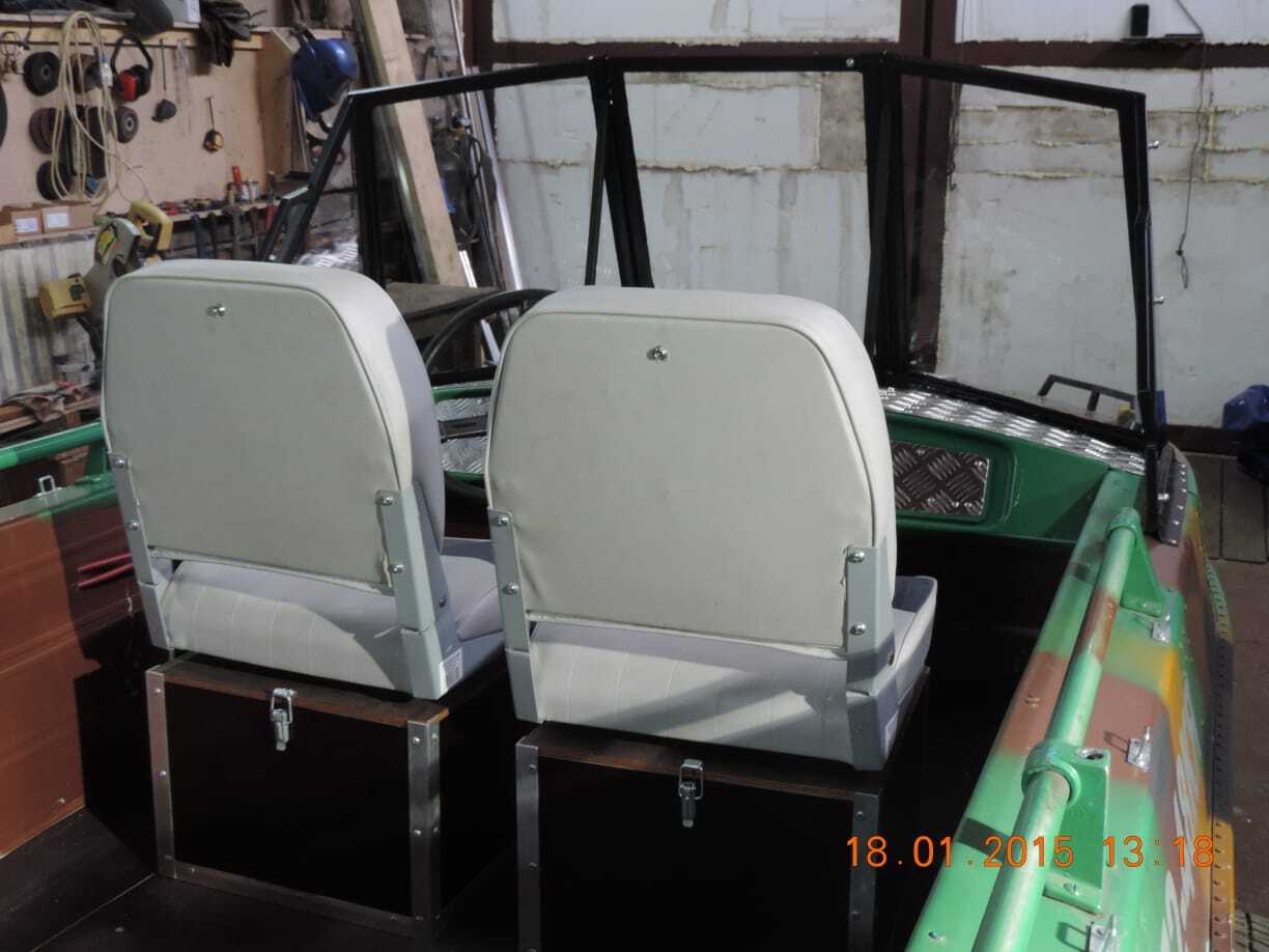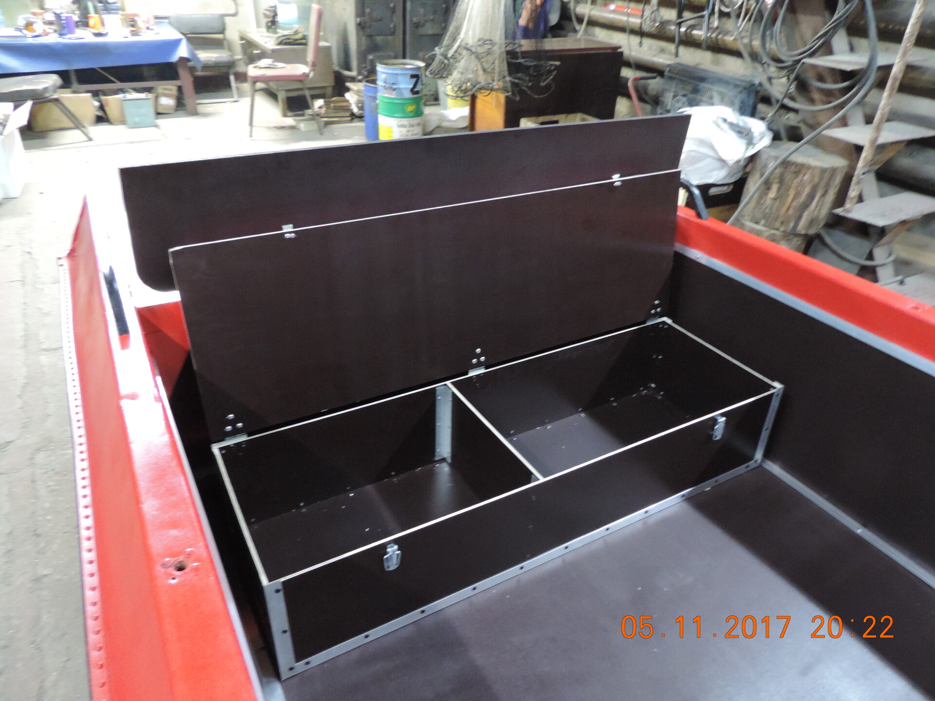 Большие рундуки из влагостойкой фанеры под сидения с дальнейшим креплением поворотной платформы.